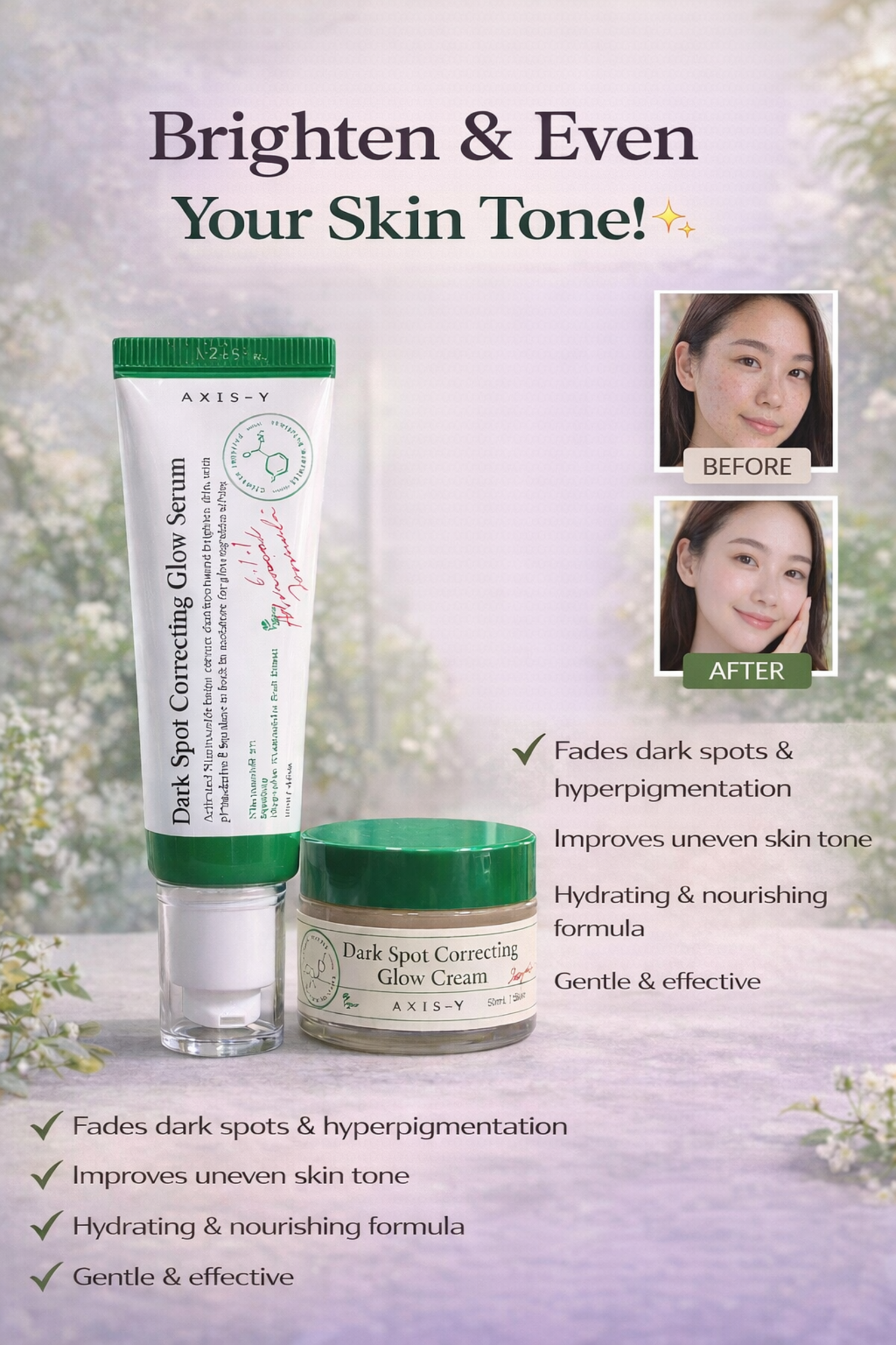 AXIS-Y Dark Spot Correcting Glow Combo is a powerful Korean skincare duo designed to brighten skin, fade dark spots, and restore a healthy glow. This combo includes the bestselling Dark Spot Correcting Glow Serum (50ml) and Dark Spot Correcting Glow Cream (50ml) β€” working together to improve uneven skin tone, acne marks, and dullness.