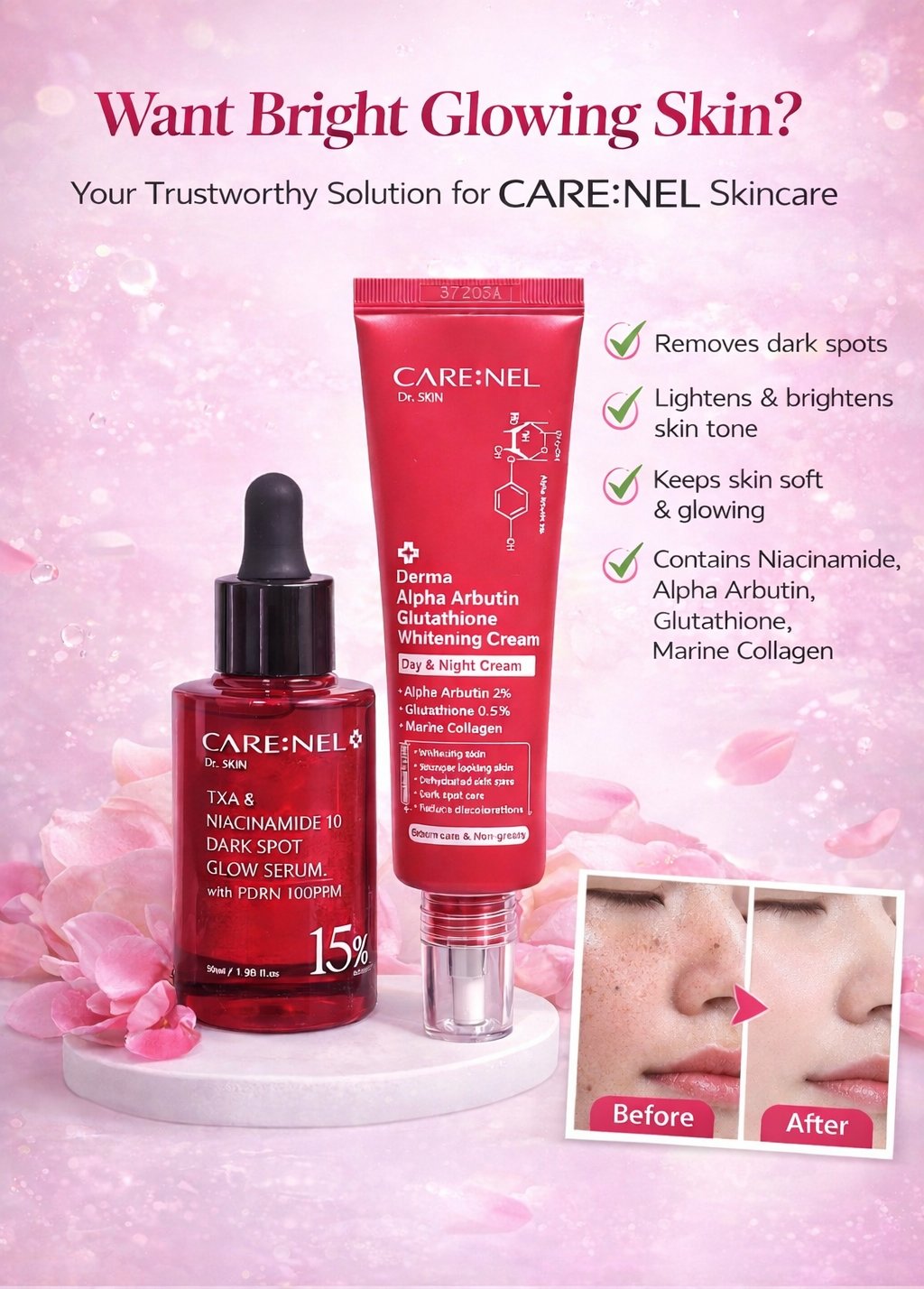The CARE:NEL TXA & Niacinamide 10 Dark Spot Glow Serum and CARE:NEL Derma Alpha Arbutin Glutathione Whitening Cream Combo is a powerful skincare duo designed to visibly reduce dark spots, brighten uneven skin tone, and enhance natural glow. This Korean skincare combo works synergistically to target pigmentation, dullness, and dehydration while improving overall skin clarity and smoothness.