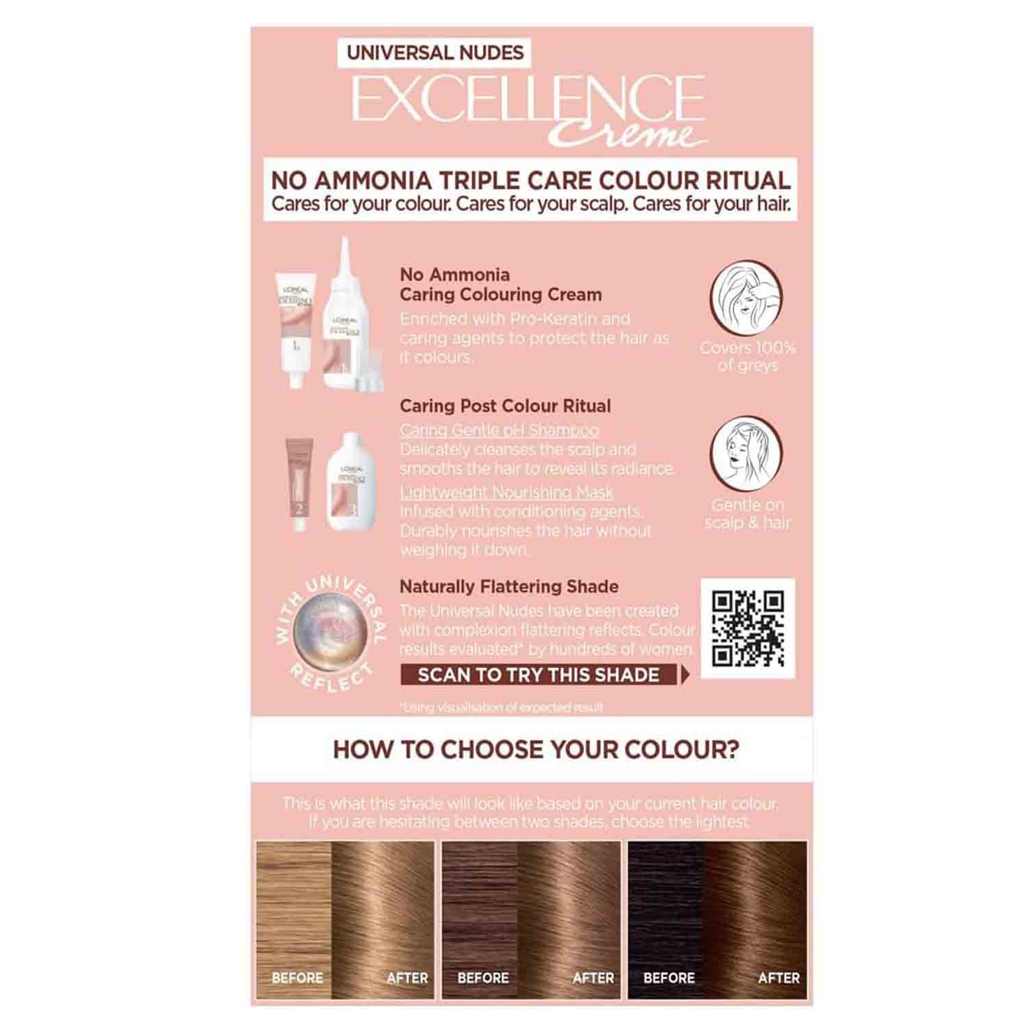 L’Oréal Paris Excellence Universal Nudes 7U – Universal Blonde is an advanced ammonia-free permanent hair colour designed to deliver a naturally radiant blonde shade that complements all skin tones and hair textures. Unlike traditional blonde dyes that can appear brassy or harsh, this Universal Nude technology balances warm and cool reflects for a soft, flattering finish that enhances your complexion beautifully.