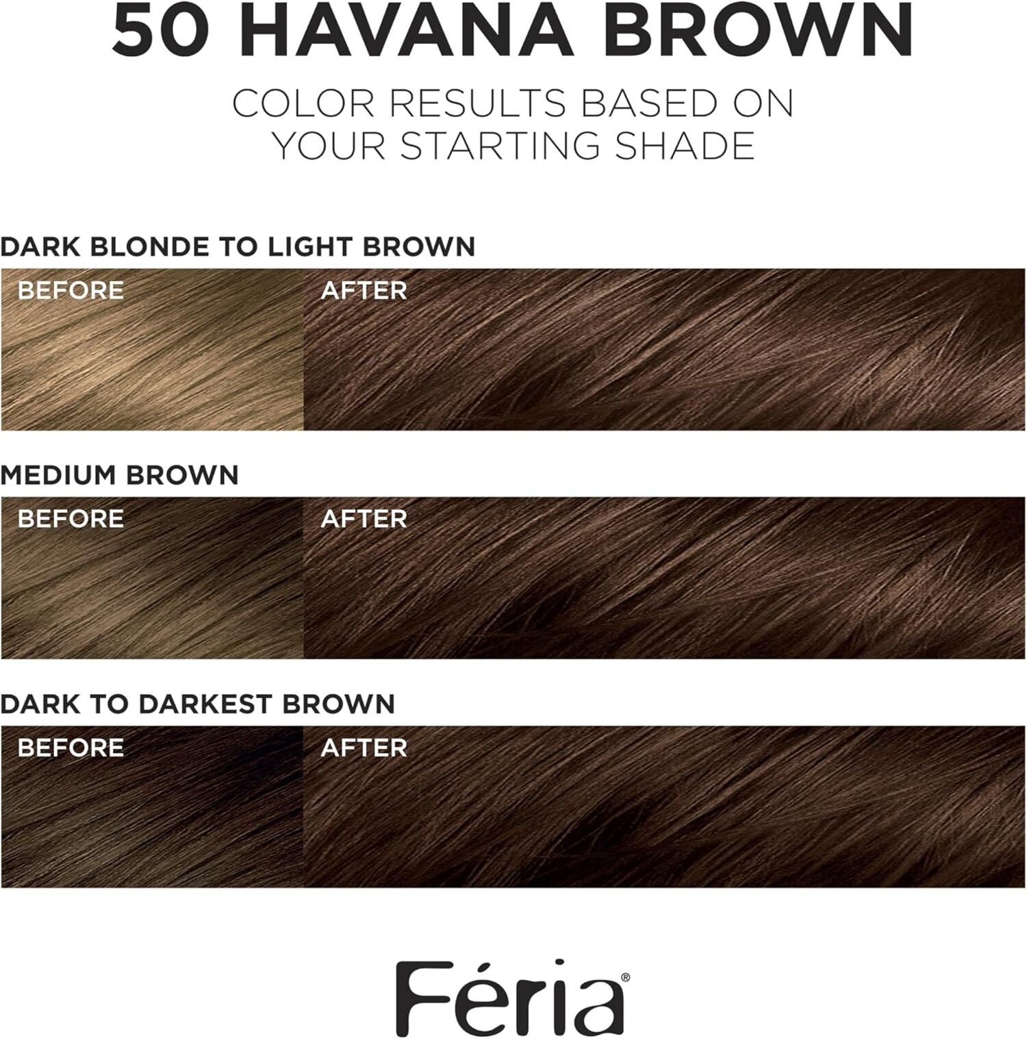 L’Oréal Paris Feria Permanent Hair Color in 50 Havana Brown offers a rich, medium brown shade with warm undertones that enhance your natural beauty. This color is perfect for those looking for a classic yet vibrant brown tone with a touch of warmth and shine.