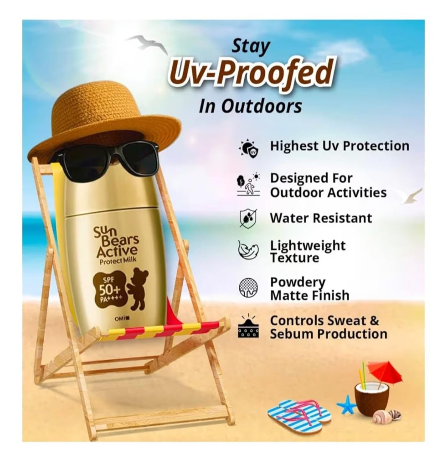 Omi Brotherhood Sun Bears Active Protect Milk SPF50+ PA++++ is a powerful, lightweight sunscreen specially designed for active lifestyles and outdoor protection. This Japanese sunscreen provides high-level broad-spectrum protection against both UVA and UVB rays, helping to prevent sunburn, tanning, and premature skin aging.