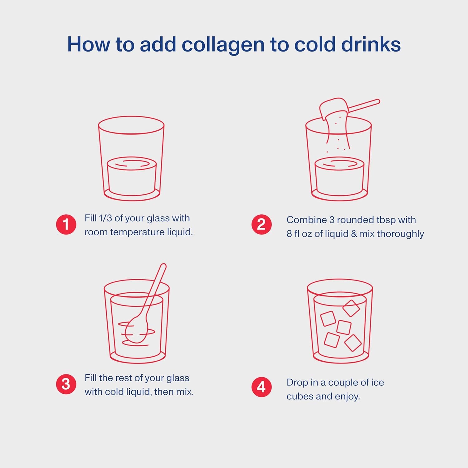 Add 1 scoop of collagen peptides to 8–12 oz of water, juice, coffee, or your favorite beverage. Stir until completely dissolved. For a creamy treat, blend with ice and fruit.